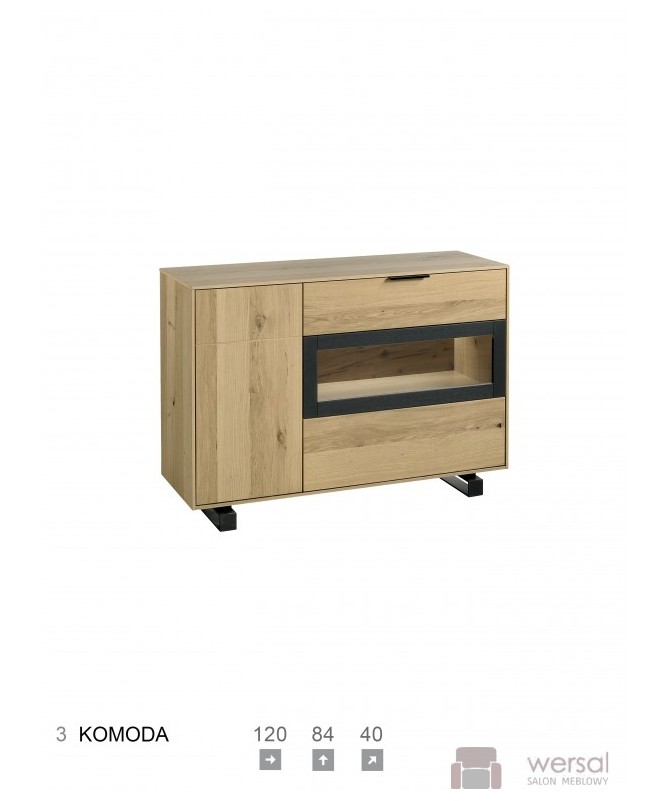 Wykonanie: Bryły wykonane z elementów drewnianych, pokrytych naturalną okleiną dębową. Oświetlenie LED eksponuje wnętrze półek z widocznymi słojami naturalnego dębu, uwidocznionymi dzięki zastosowanej technice szczotkowania. Elementy czarne wykonane z litego drewna tworzą ciekawy kontrast kolorystyczny z naturalną barwą brył. Lekkości kolekcji dodają czarne metalowe nózki. Wysokość nóżek ok. 10 cm. System: cichy domyk, uchwyt czarny krawędziowy - tylko przy szufladach, drzwi - push to open.