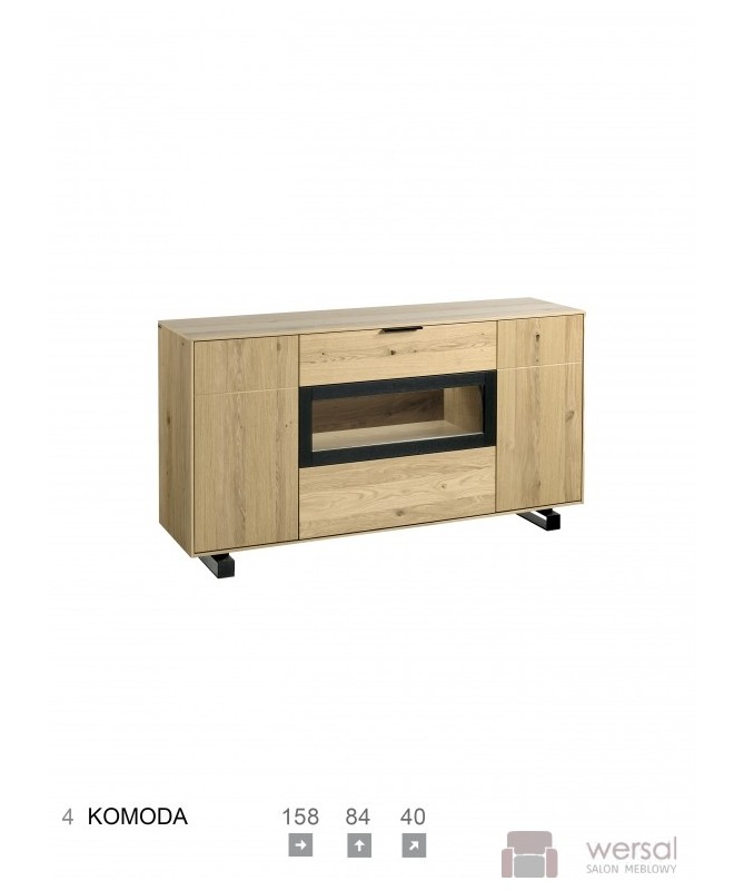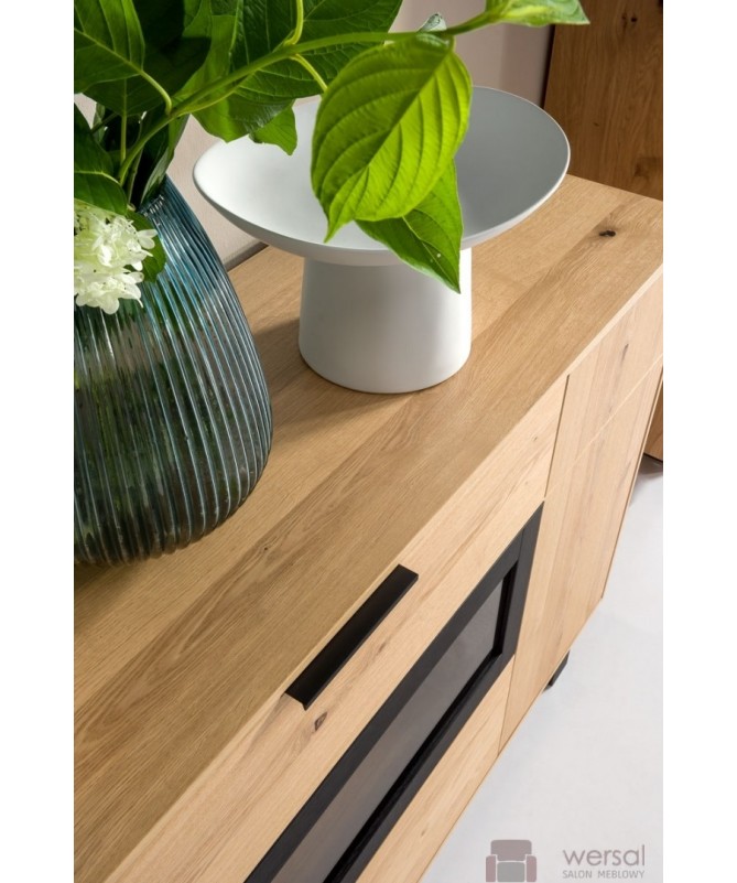 Wykonanie: Bryły wykonane z elementów drewnianych, pokrytych naturalną okleiną dębową. Oświetlenie LED eksponuje wnętrze półek z widocznymi słojami naturalnego dębu, uwidocznionymi dzięki zastosowanej technice szczotkowania. Elementy czarne wykonane z litego drewna tworzą ciekawy kontrast kolorystyczny z naturalną barwą brył. Lekkości kolekcji dodają czarne metalowe nózki. Wysokość nóżek ok. 10 cm. System: cichy domyk, uchwyt czarny krawędziowy - tylko przy szufladach, drzwi - push to open.
