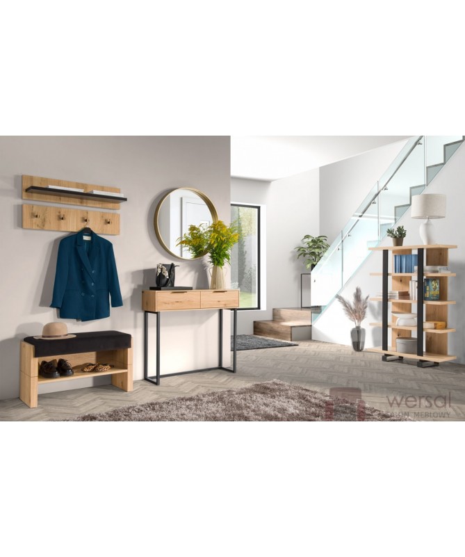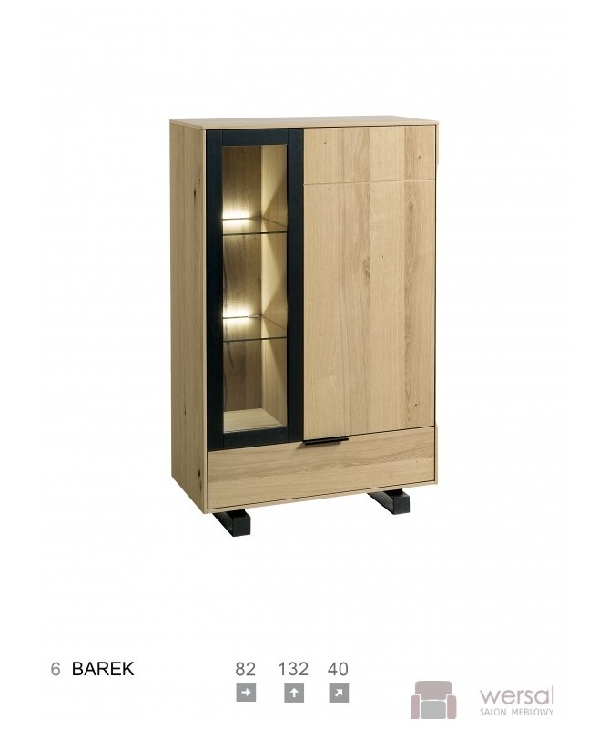 Wykonanie: Bryły wykonane z elementów drewnianych, pokrytych naturalną okleiną dębową. Oświetlenie LED eksponuje wnętrze półek z widocznymi słojami naturalnego dębu, uwidocznionymi dzięki zastosowanej technice szczotkowania. Elementy czarne wykonane z litego drewna tworzą ciekawy kontrast kolorystyczny z naturalną barwą brył. Lekkości kolekcji dodają czarne metalowe nózki. Wysokość nóżek ok. 10 cm. System: cichy domyk, uchwyt czarny krawędziowy - tylko przy szufladach, drzwi - push to open.