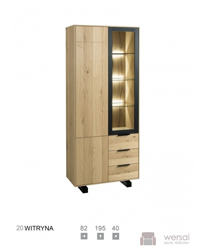 Wykonanie: Bryły wykonane z elementów drewnianych, pokrytych naturalną okleiną dębową. Oświetlenie LED eksponuje wnętrze półek z widocznymi słojami naturalnego dębu, uwidocznionymi dzięki zastosowanej technice szczotkowania. Elementy czarne wykonane z litego drewna tworzą ciekawy kontrast kolorystyczny z naturalną barwą brył. Lekkości kolekcji dodają czarne metalowe nózki. Wysokość nóżek ok. 10 cm. System: cichy domyk, uchwyt czarny krawędziowy - tylko przy szufladach, drzwi - push to open.