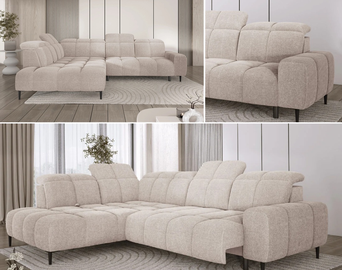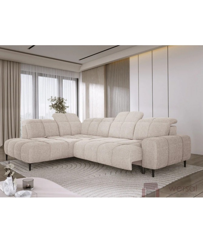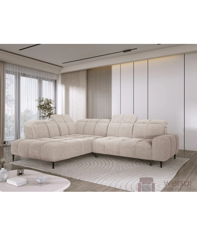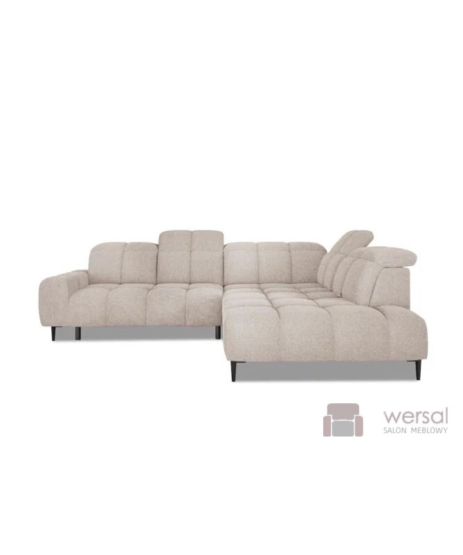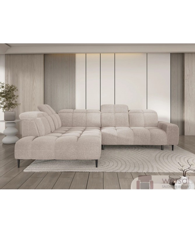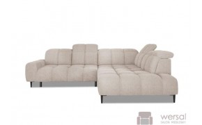Cechy charakterystyczne: Narożnik na sprężynach falistych oraz piance. Posiada regulowane zagłówki, możliwość zamówienia strony lewej oraz prawej.
