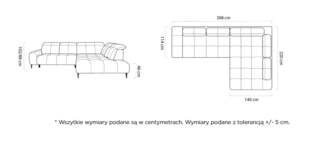 Wymiary: Szerokość 308 cm / Głębokość 220 cm / Wysokość 88/102 cm