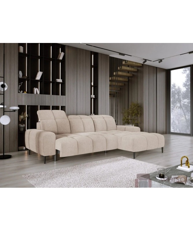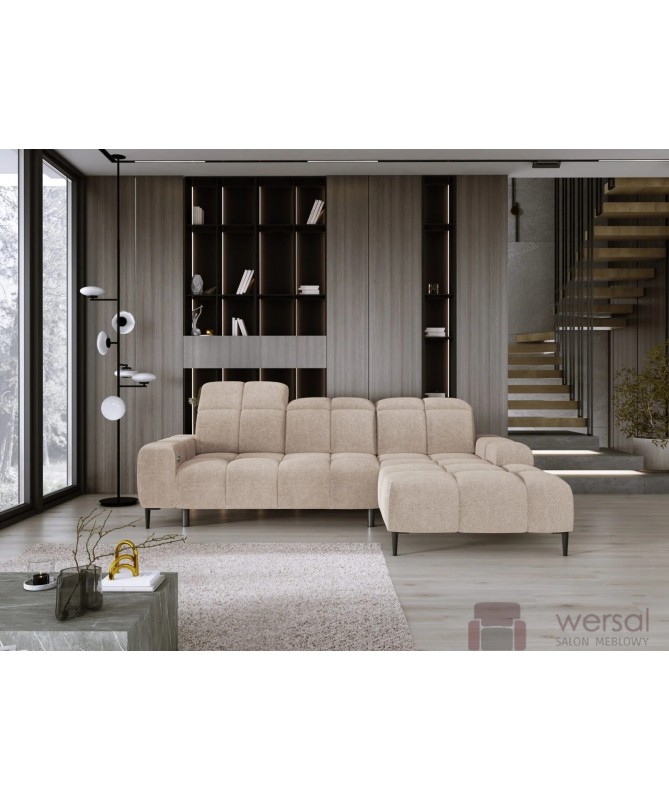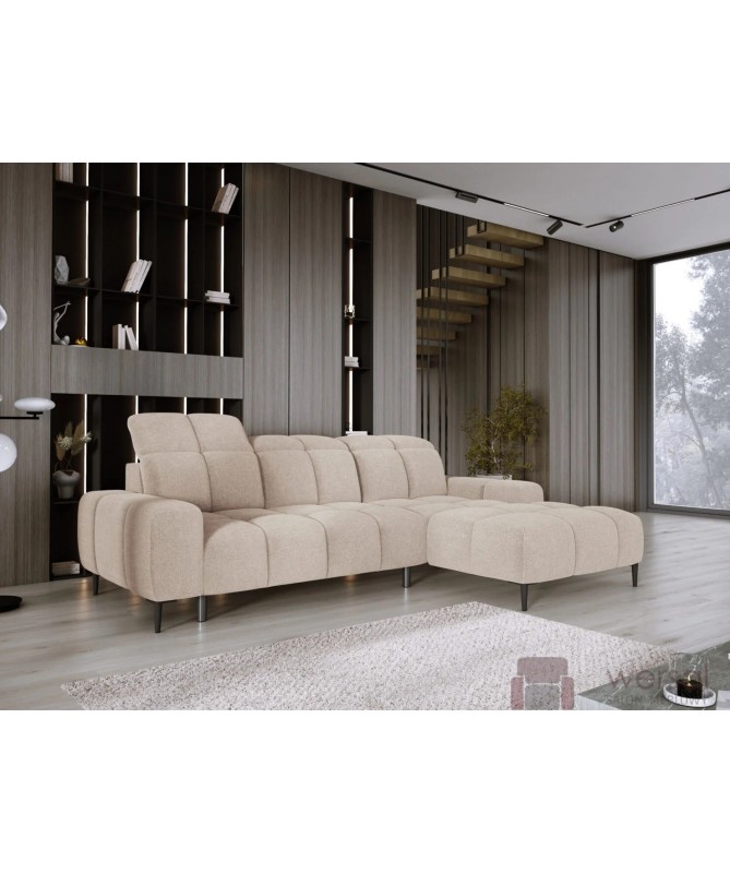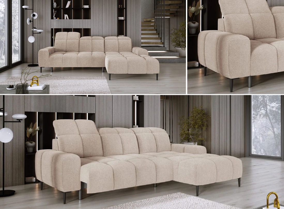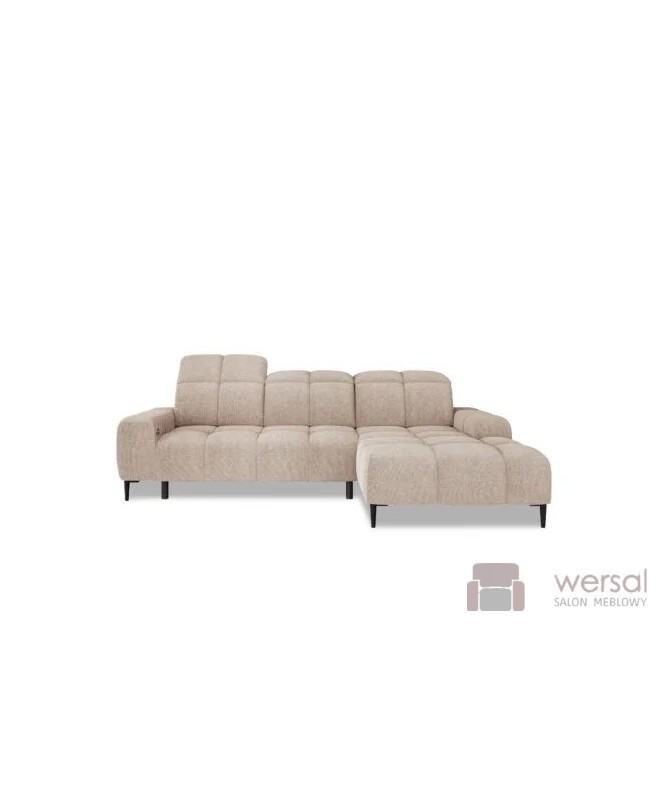 Cechy charakterystyczne: Narożnik na sprężynach falistych oraz piance. Posiada regulowane zagłówki, możliwość zamówienia strony lewej oraz prawej.