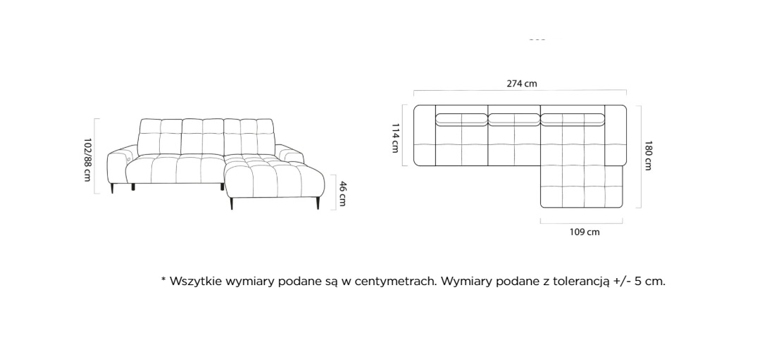 Wymiary: Szerokość 274 cm / Głębokość 180 cm / Wysokość 88/102 cm