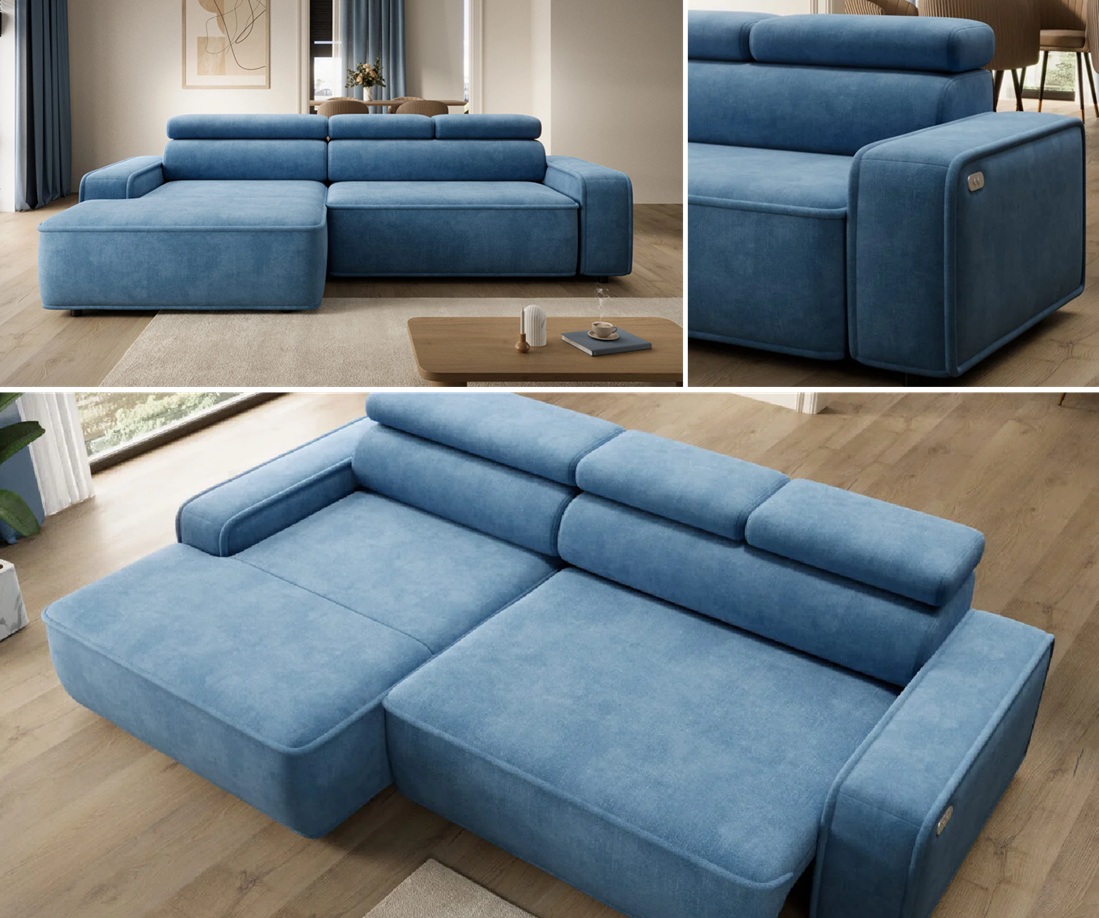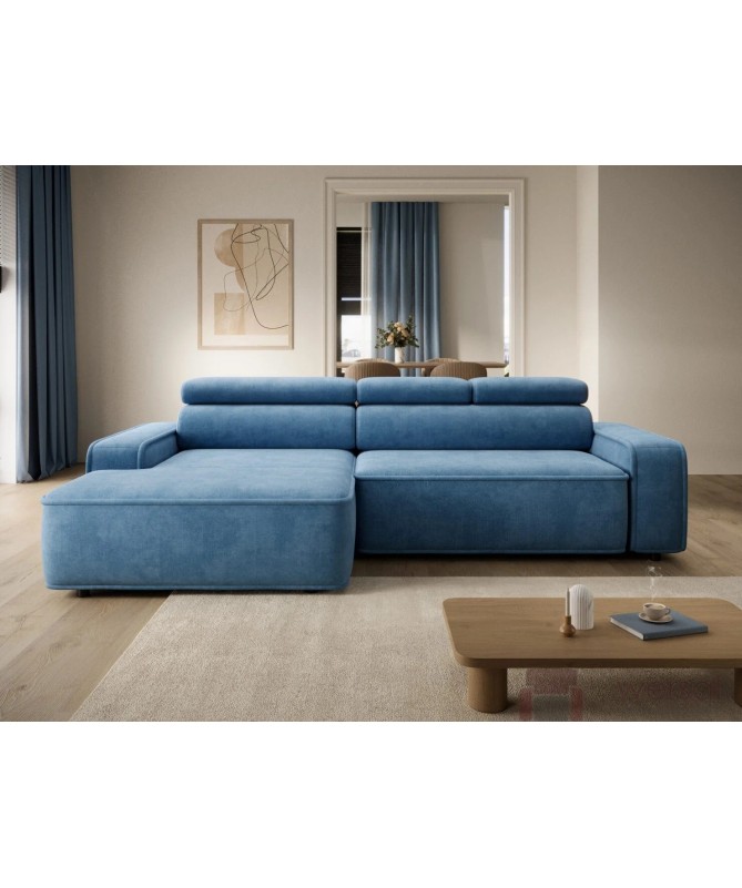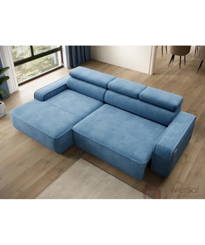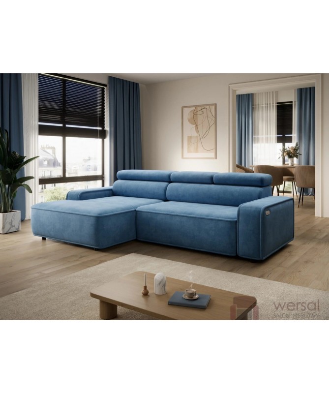 Cechy charakterystyczne: Narożnik na sprężynach falistych oraz piance. Posiada regulowane zagłówki, możliwość zamówienia strony lewej oraz prawej.
