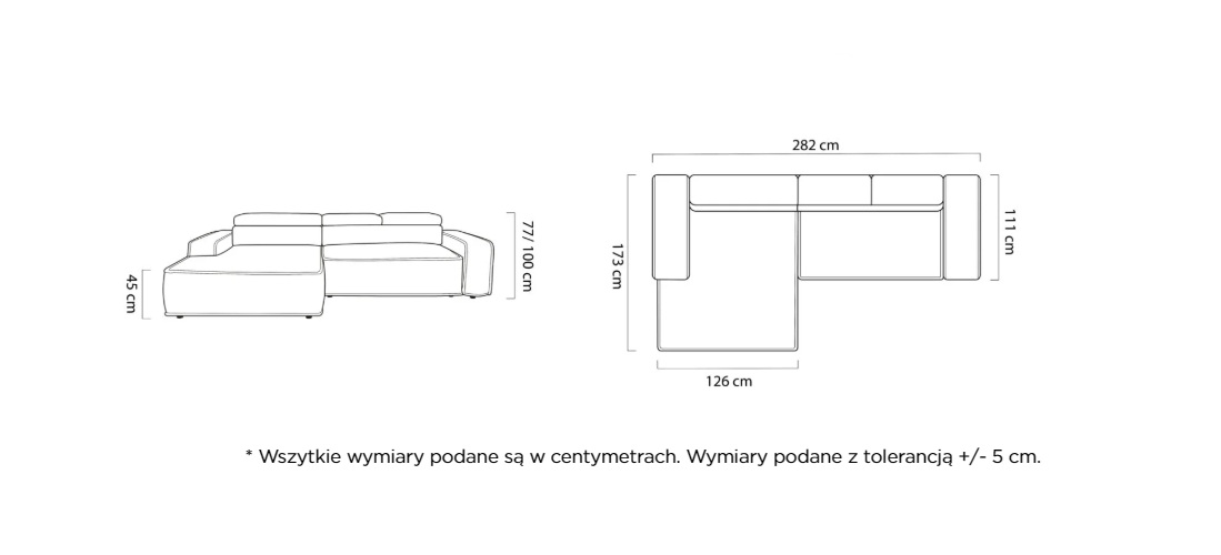 Wymiary: Szerokość 282 cm / Głębokość 173 cm / Wysokość 77/100 cm
