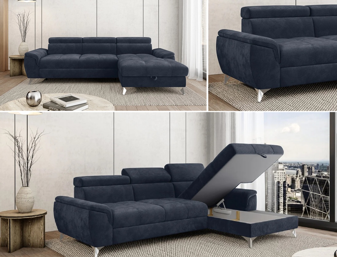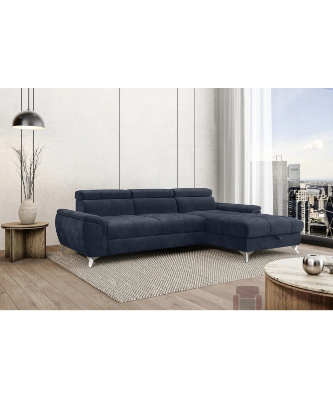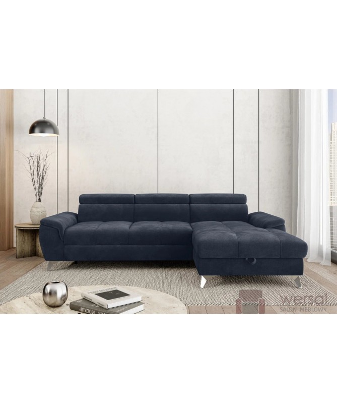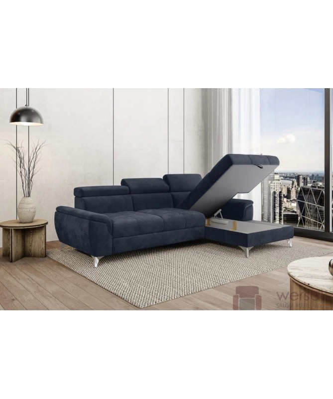 Cechy charakterystyczne: Narożnik na sprężynach falistych oraz piance. Posiada regulowane zagłówki, możliwość zamówienia strony lewej oraz prawej.