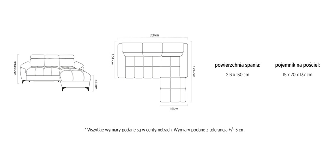 Wymiary: Szerokość 268 cm / Głębokość 174 cm / Wysokość 86/99 cm / Powierzchnia spania 213x130 cm