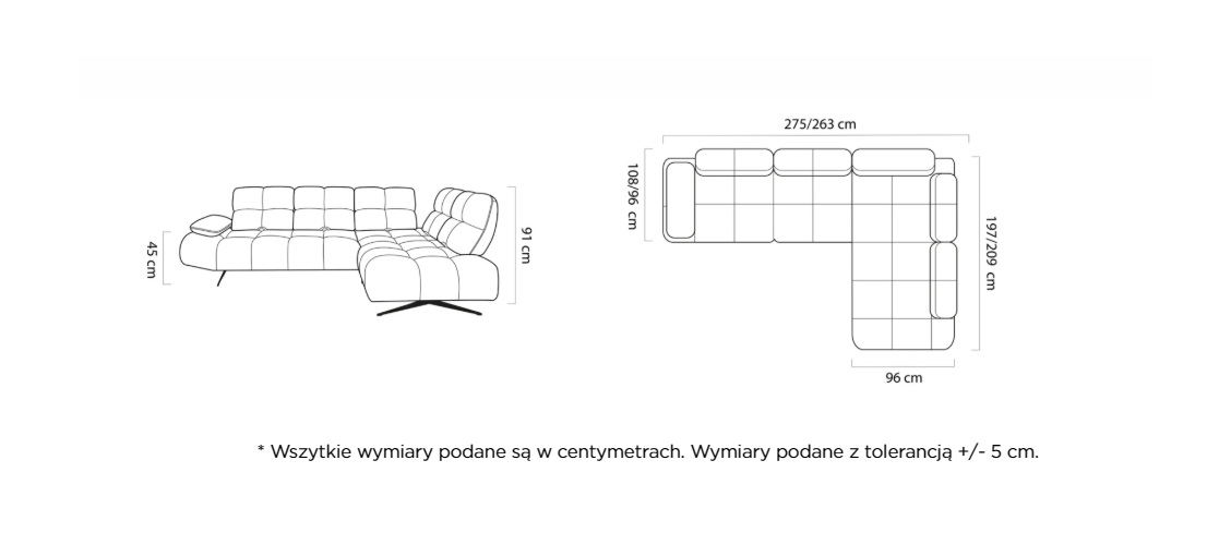 Wymiary: Szerokość 275 cm / Głębokość 209 cm / Wysokość 91 cm