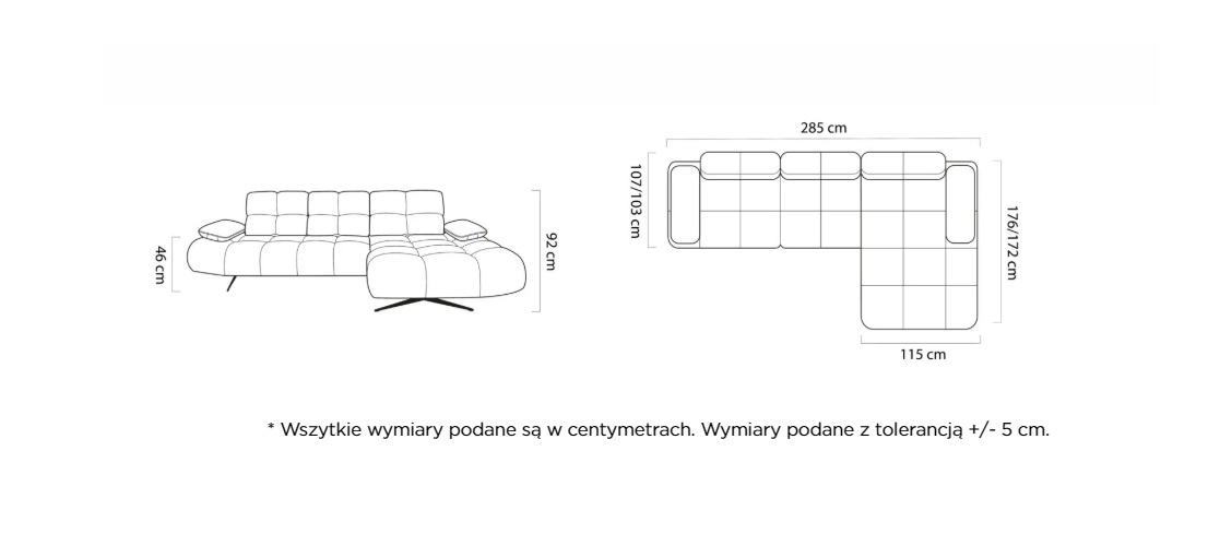 Wymiary: Szerokość 285 cm / Głębokość 176 cm / Wysokość 91 cm