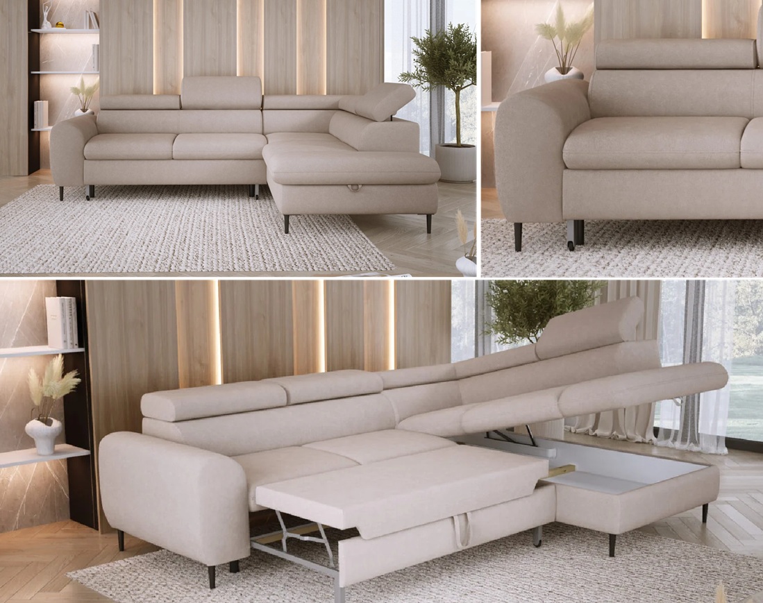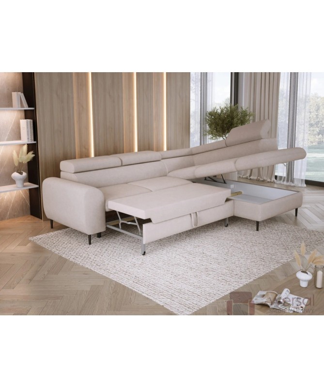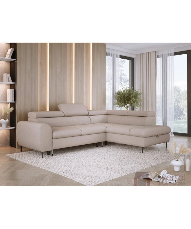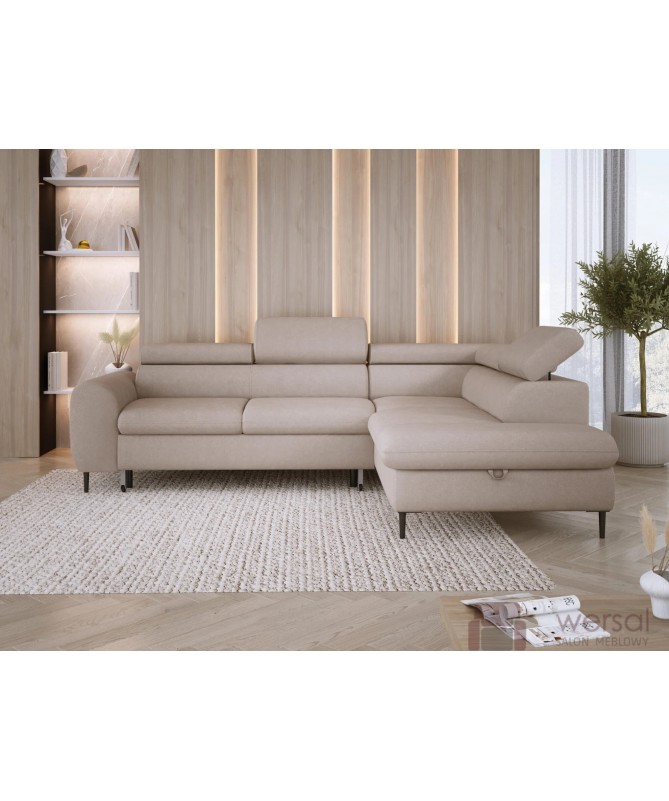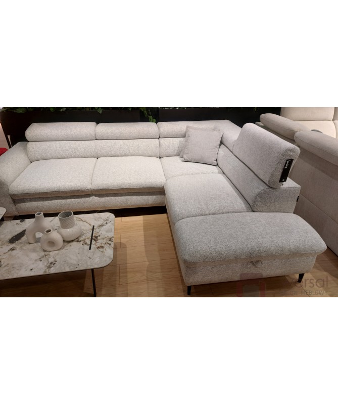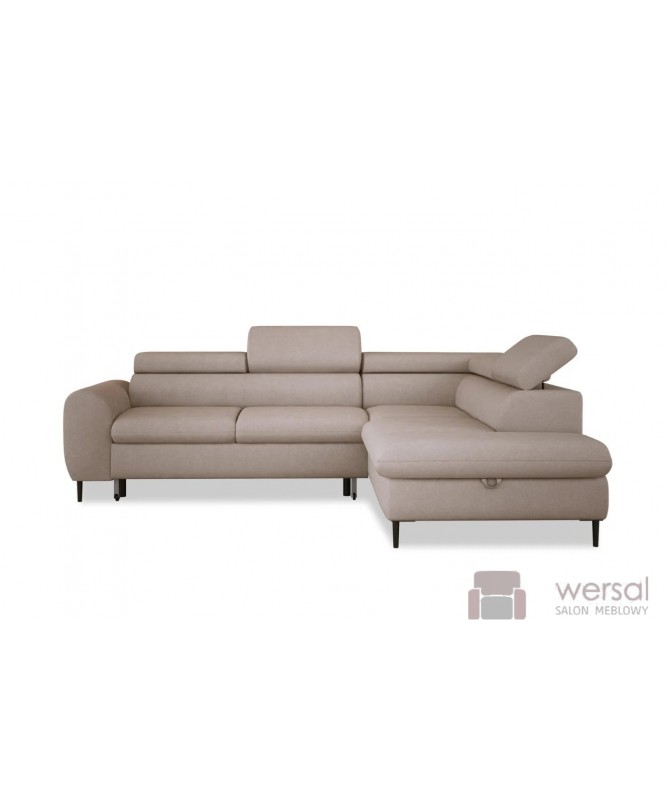 Cechy charakterystyczne: Narożnik na sprężynach falistych oraz piance. Posiada regulowane zagłówki, możliwość zamówienia strony lewej oraz prawej.