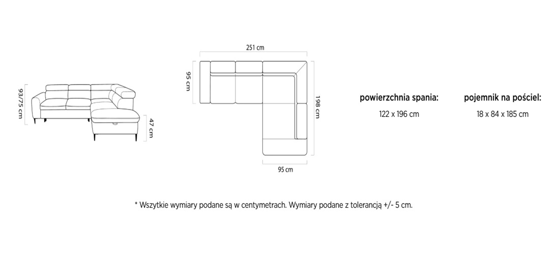 Wymiary: Szerokość 251 cm / Głębokość 198 cm / Wysokość 75/93 cm / Powierzchnia spania 196x122 cm