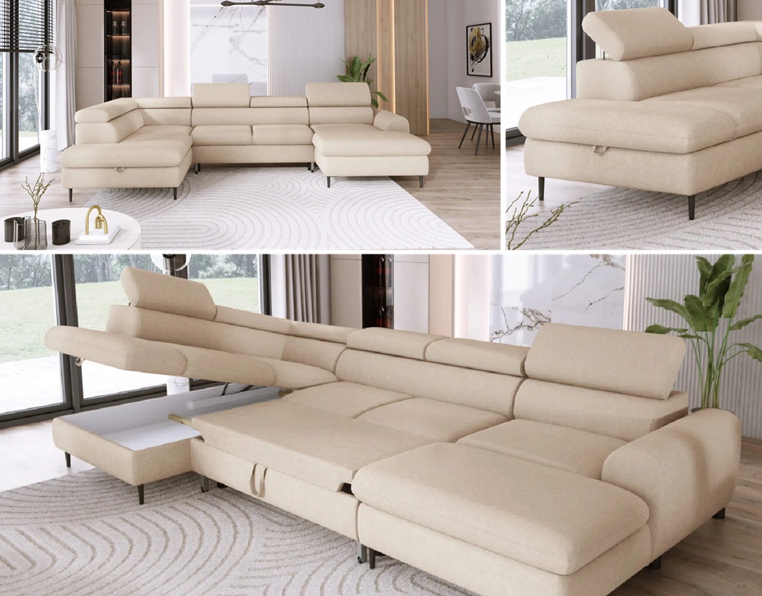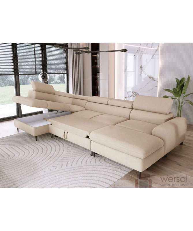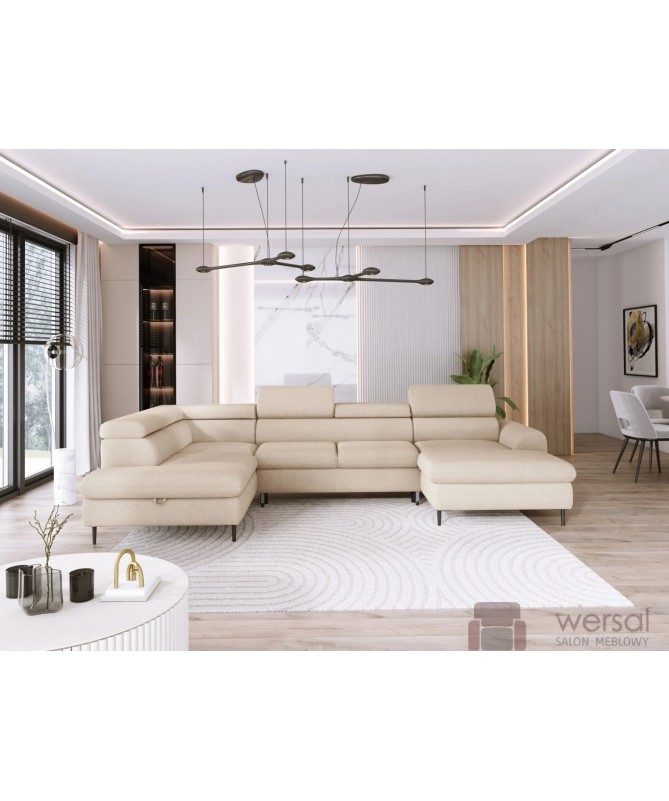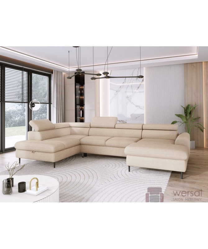 Cechy charakterystyczne: Narożnik na sprężynach falistych oraz piance. Posiada regulowane zagłówki, możliwość zamówienia strony lewej oraz prawej.