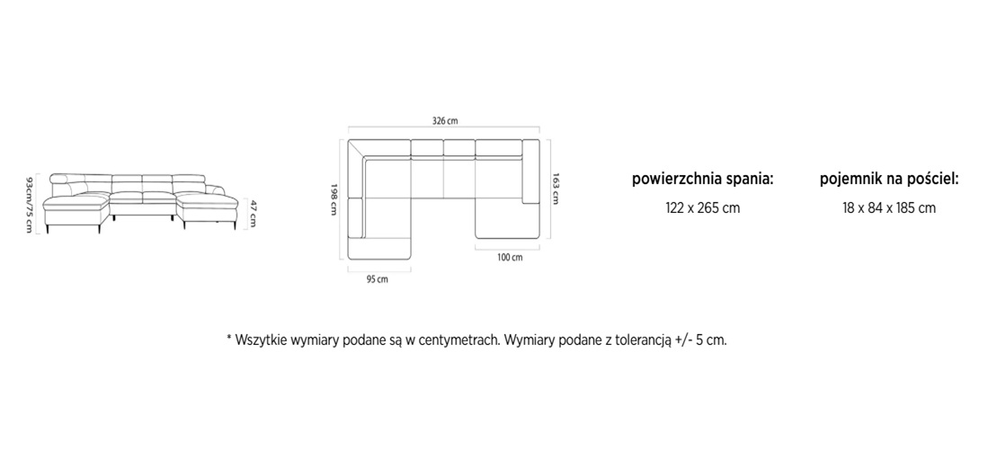 Wymiary: Szerokość 326 cm / Głębokość 163/198 cm / Wysokość 75/93 cm / Powierzchnia spania 265x122 cm