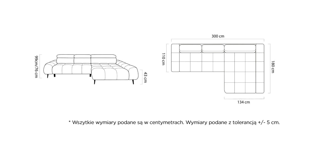 Wymiary: Szerokość 300 cm / Głębokość 180 cm / Wysokość 76/99 cm